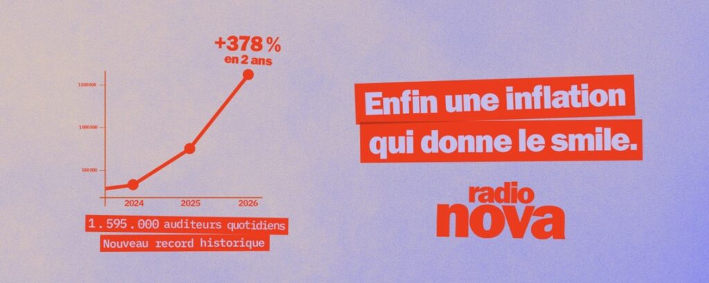 Après une fin d’année 2025 déjà historique, Radio Nova signe un quatrième record à la suite avec 1 595 000 auditeurs quotidiens pour atteindre une audience cumulée de 2,8% sur la période janvier-mars 2026. La station réussit l’exploit de gagner 830 000 auditeurs en un an (+108%) et de multiplier son audience par 4 en deux ans.